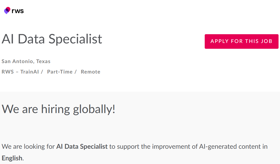 RWS AI Data Specialists 라고 Hiring한다고 포지션 오픈 소식을 전해왔다.
